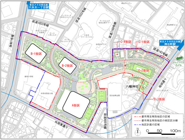 ・工事区画は外苑東通りのロシア大使館向かい、麻布郵便局・首都高3号線に面した地区・桜田通りオランダヒルス森タワーにかけての広大なエリアを更地にして再開発となる。